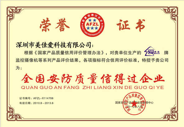 全國安防質量信得過企業證書副本